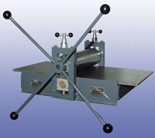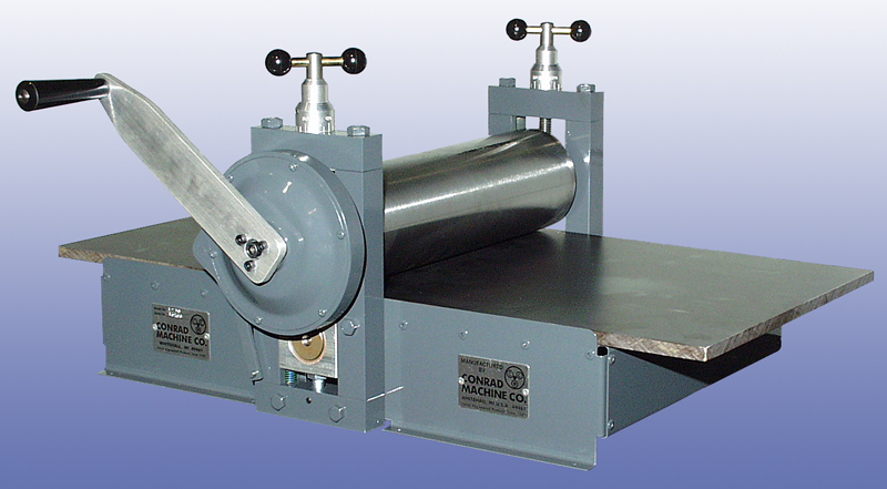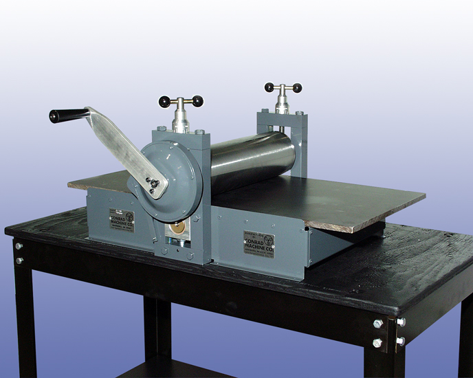 Most of the small Etching Presses being built today are not built to the same standards as large professional presses. Inadequate gearing, or no gearing at all, and unavailability of desired options are probably the greatest drawbacks of most small Etching Presses. When Conrad Machine Company designed the E-12 and E-15 Etching Presses, we gave them the same professional features and options that are available on our large professional presses. We offer an extensive line of options, so the printmaker can purchase exactly what he needs. Our presses are fully customizable, so you can get exactly what you need.