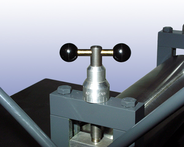 Most small presses are not even available with Micro-Gauges. The small presses that do offer micro-gauges use a scale type design that is inferior to a barrel-thimble design. Conrad Machine Co. offers a barrel-thimble Micro-Gauge that is calibrated to .005 inch per line. This means that you can adjust each pressure screw by about the same thickness as a human hair! The Conrad Machine Co. Micro-guages are the very best in the printmaking industry.